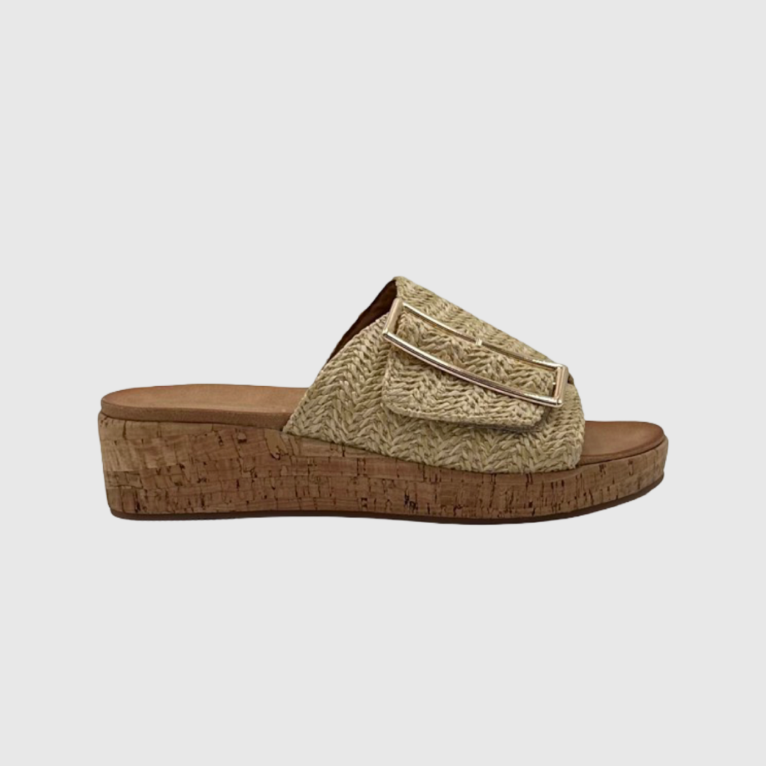 Step into effortless summer style with these natural cork platform slides. Featuring a woven textured upper and a statement buckle, these sandals combine laid-back charm with modern design.