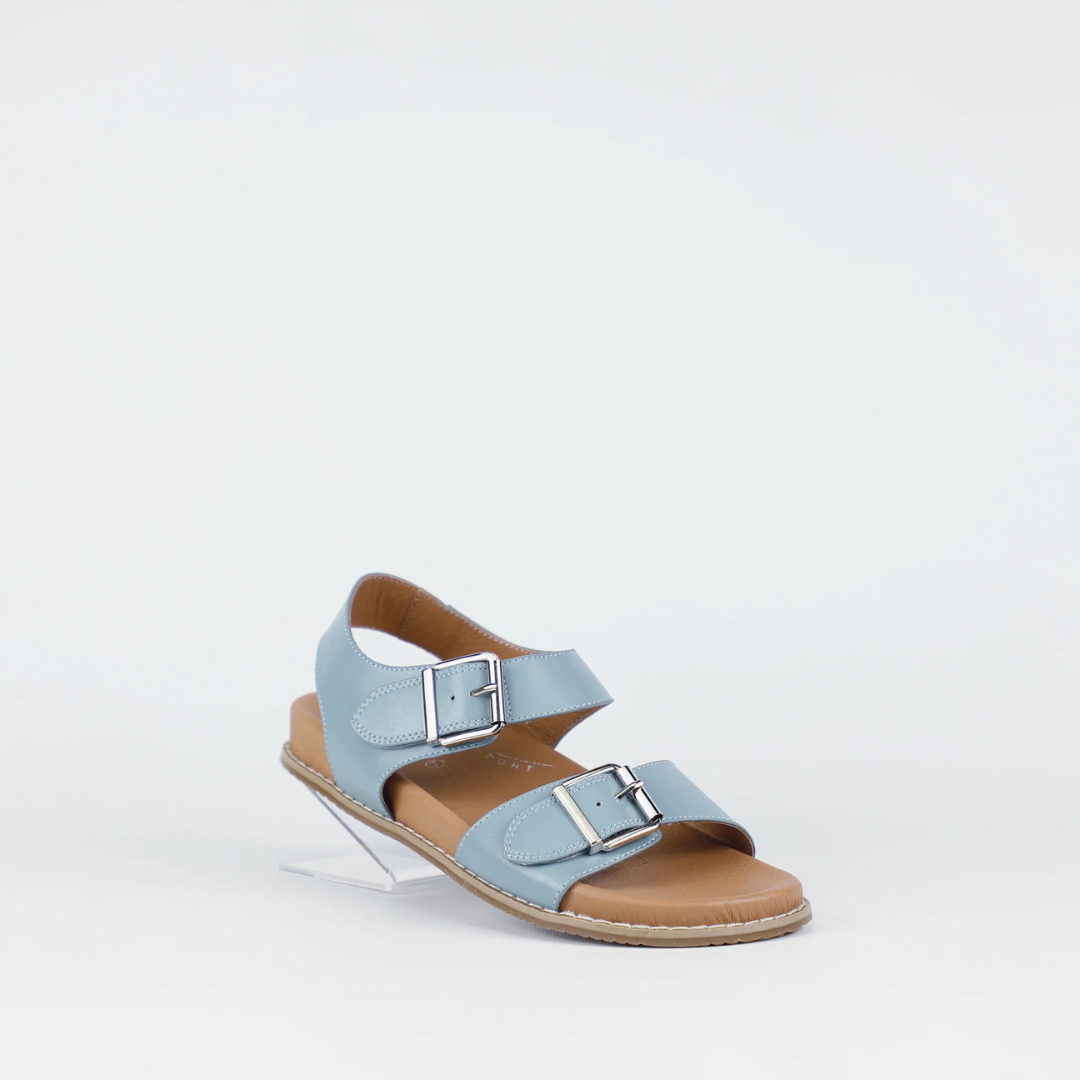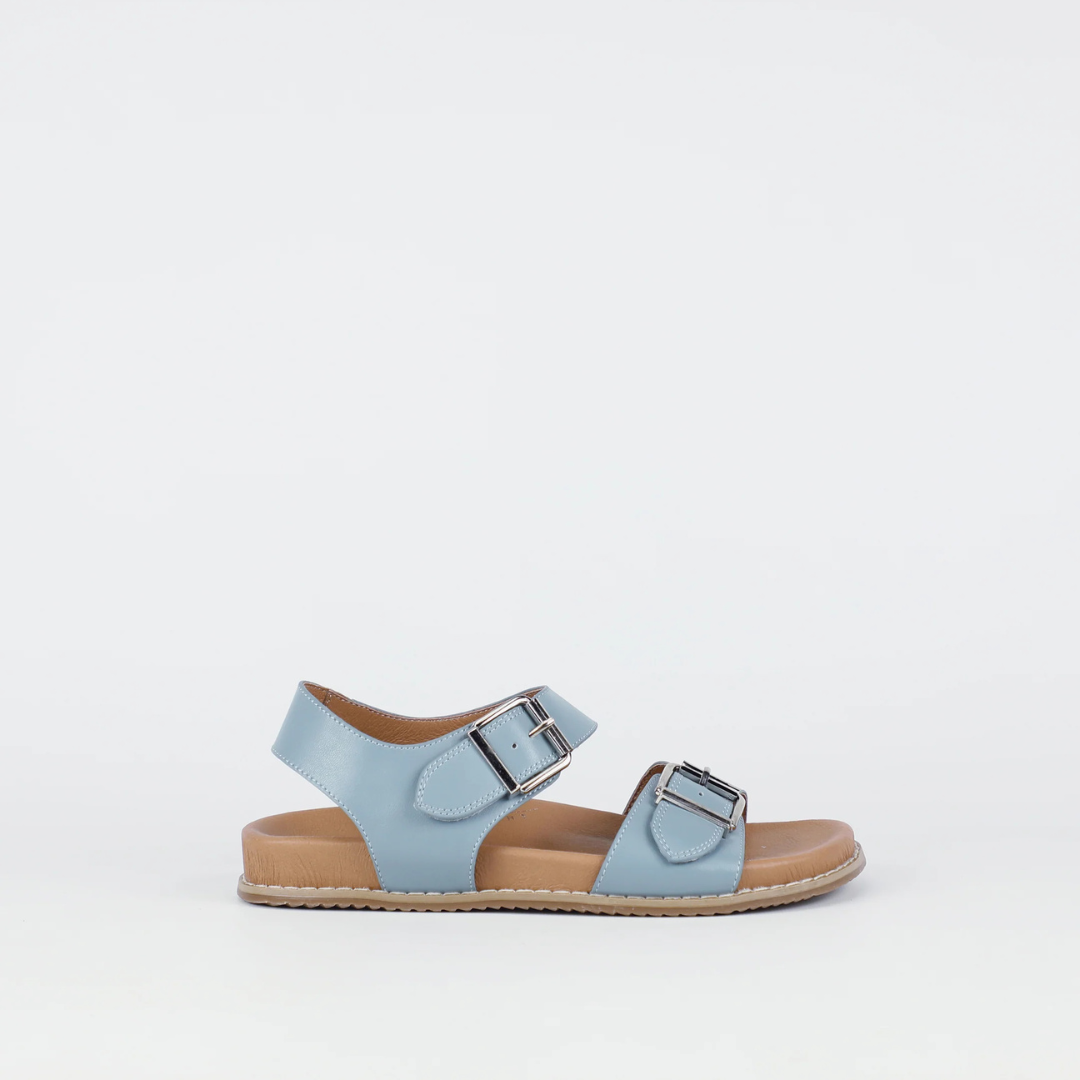 Step into casual cool with Zeus in denim. Crafted from smooth leather in a versatile blue finish, this sandal features bold double buckle straps and a cushioned footbed. The lightweight sole ensures comfort, making it the perfect blend of everyday ease and on-trend design.