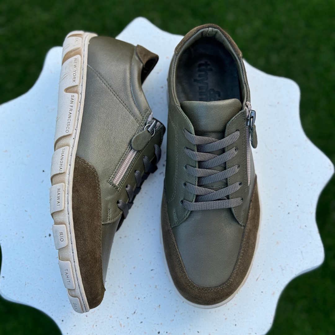 Combining everyday comfort with a sporty edge, the Thyme & Co North sneaker in Olive is the perfect go-to for effortless styling. Crafted from soft leather with a contrasting suede toe, the muted olive tone offers a modern, versatile look.