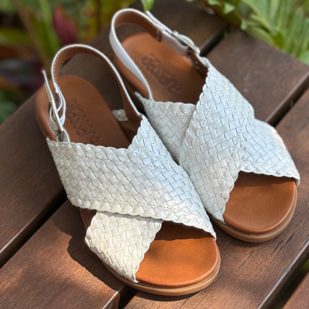 The pearl white woven straps create a flattering criss-cross design that adds texture and sophistication to any outfit, while the adjustable slingback strap ensures a secure and comfortable fit. Perfect for everyday wear or special occasions, these sandals offer both style and ease.