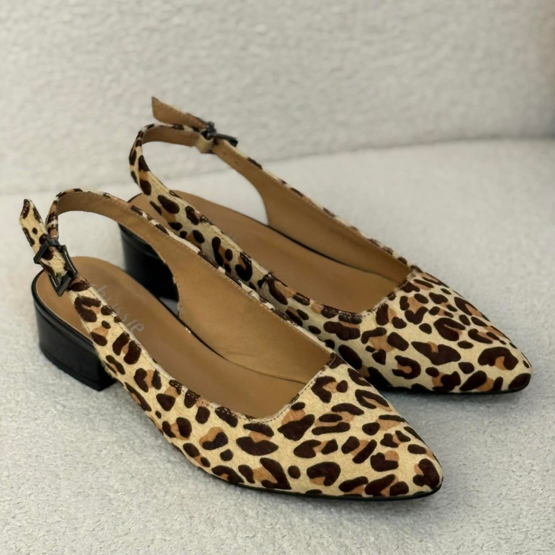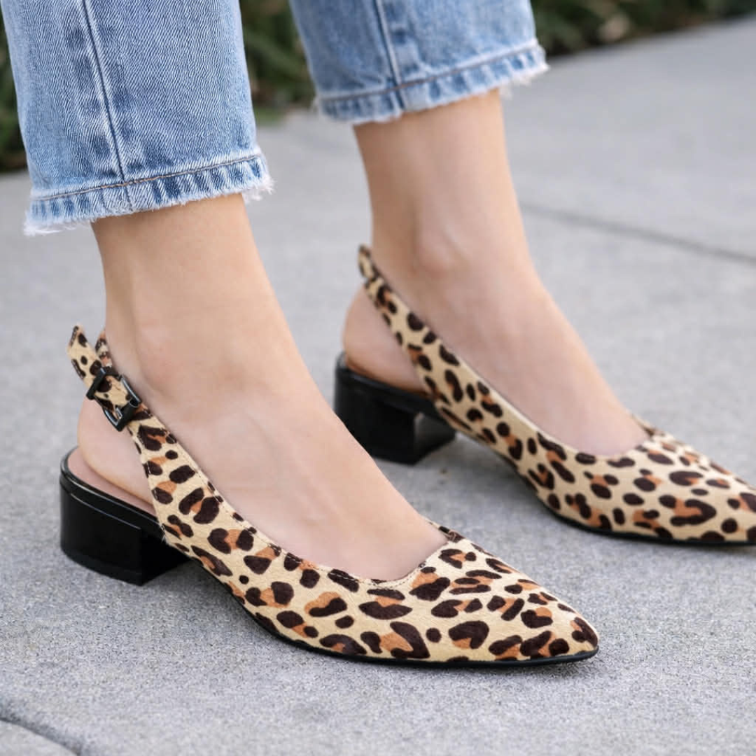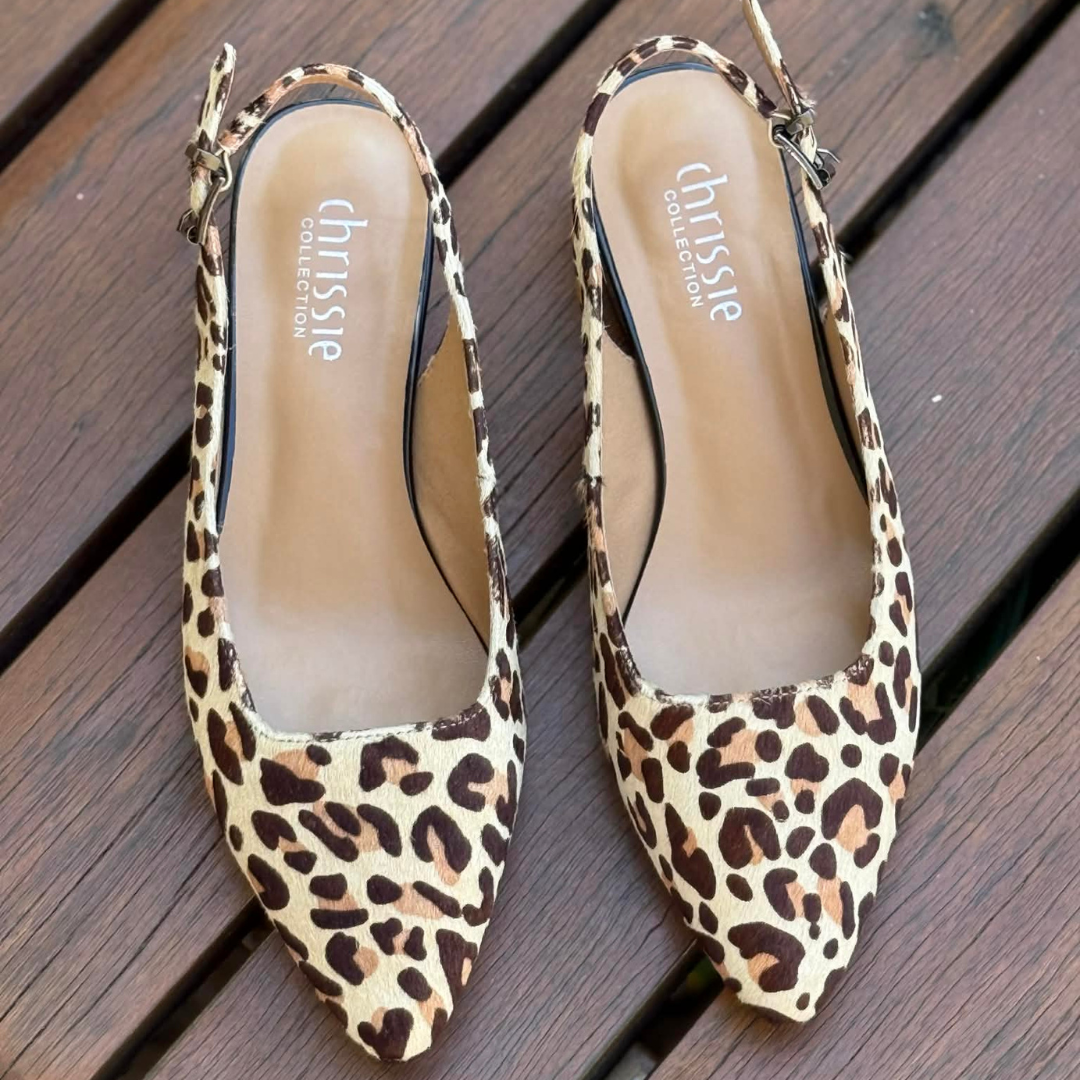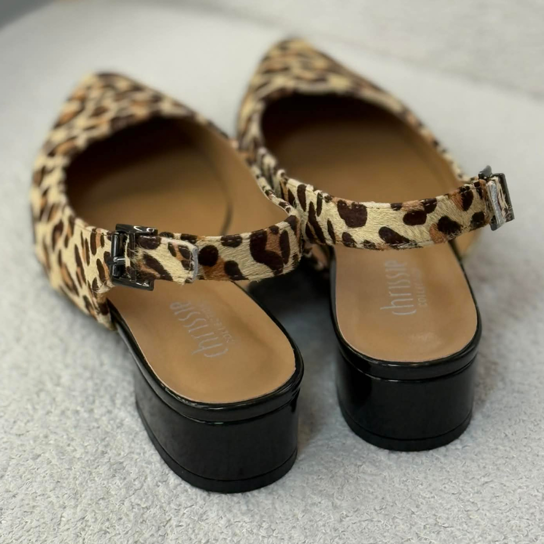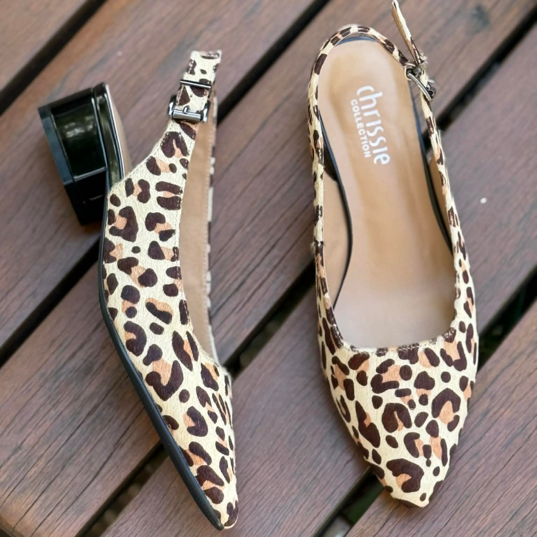 Shop the Chrissie Dove Leopard Print Pony Slingback — a versatile block heel perfect for work to weekend wear. Featuring a luxe pony hair upper in classic leopard print, pointed toe silhouette, scalloped trim detail, and an adjustable slingback strap for all-day comfort. The low black block heel makes these a practical yet stylish choice for women who refuse to compromise. Available now — a wardrobe staple that sells fast every season.