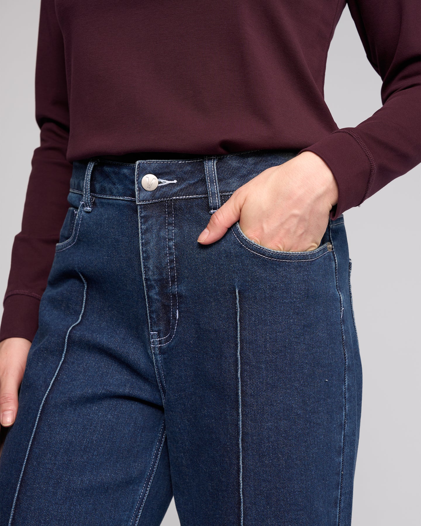 Wide-leg ankle-length jean in Dark Blue, designed with a deep hem panel and centre-front seam detailing down each leg for a refined, modern finish.