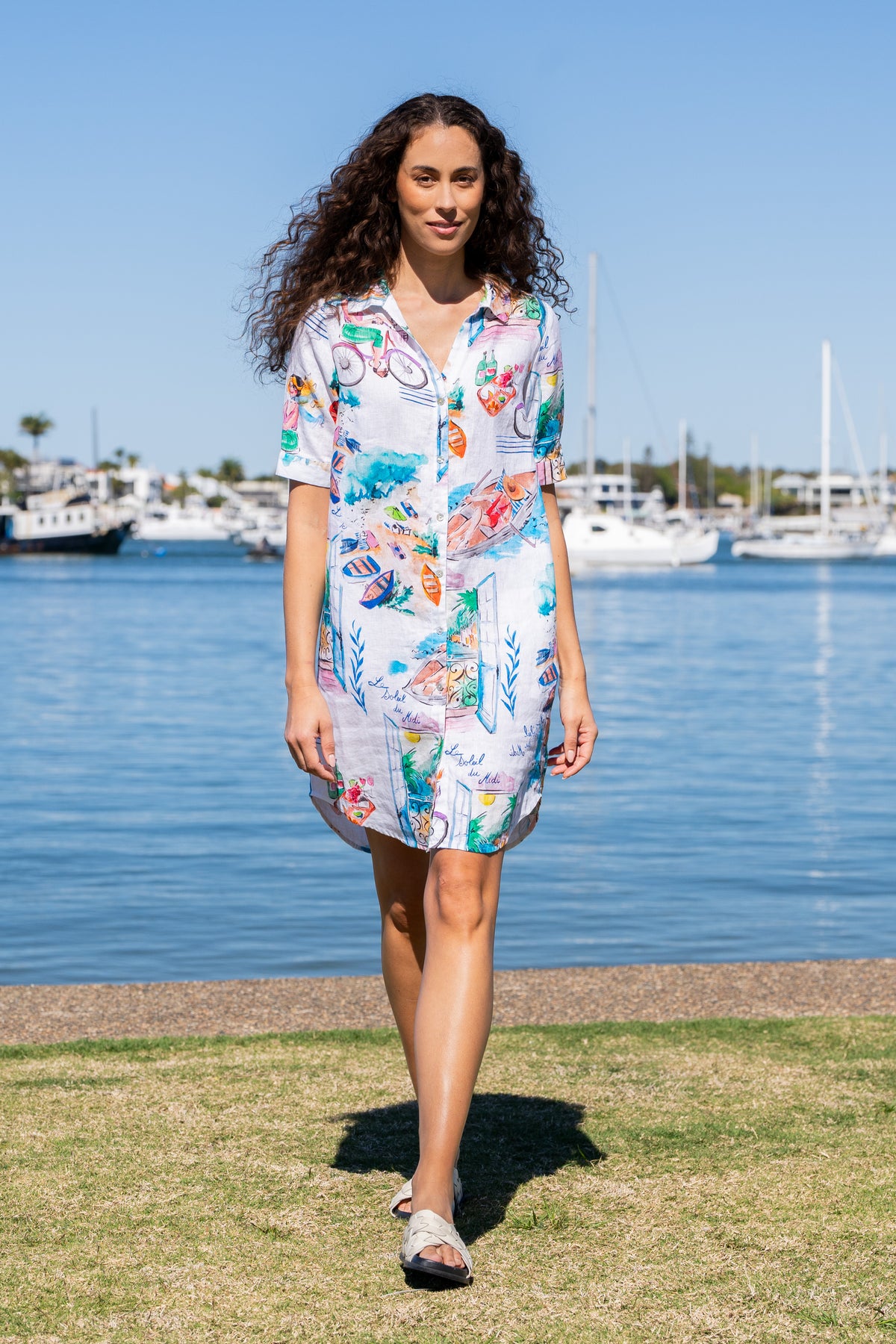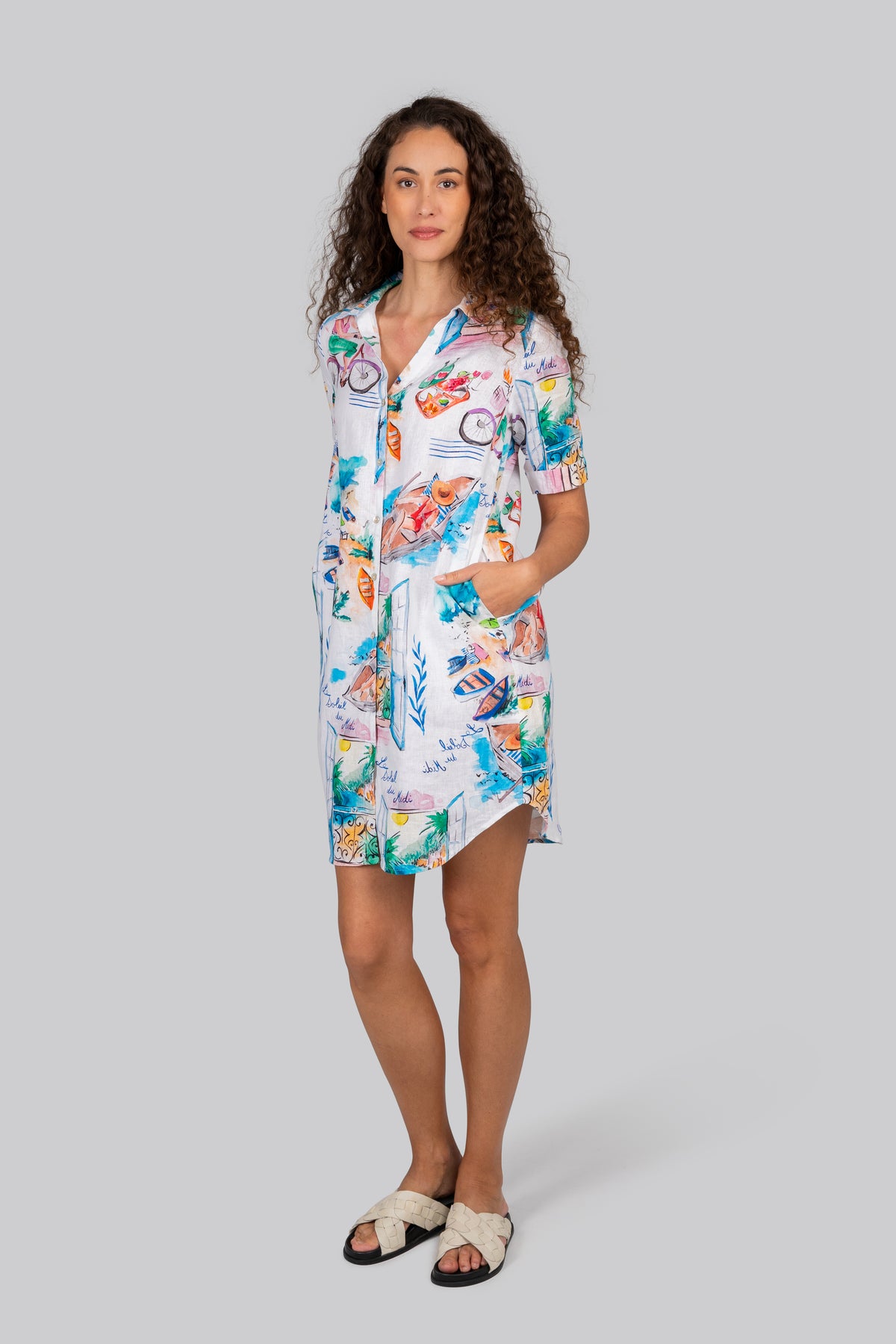Effortlessly chic with a holiday state of mind, the Kaleido Shirtmaker Dress in French Riviera is crafted from 100% breathable linen for cool, comfortable wear. Featuring the same hand-illustrated coastal print, this dress captures the charm of Mediterranean days—boats drifting in the harbor, open windows, bicycles, and sunlit seaside moments.