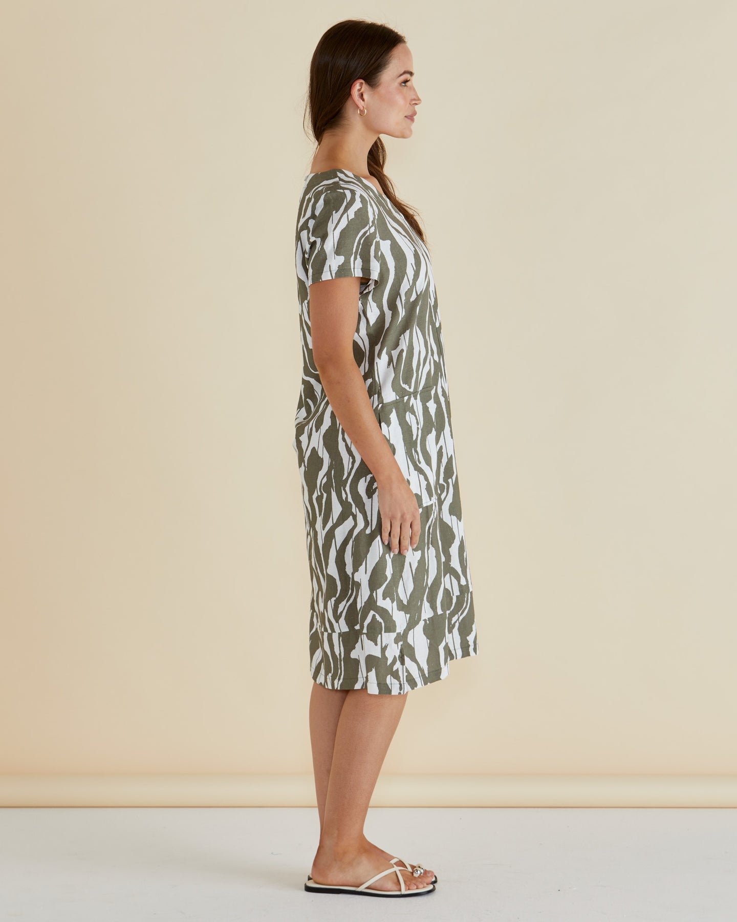 The Elwood Dress blends breathable viscose/linen fabric with a relaxed, oversized fit for ultimate comfort. Its V-neckline and side splits add a refined, elevated edge to this classic silhouette. Pockets enhance its practicality, making it an easy, transeasonal dress that effortlessly transitions through the seasons.