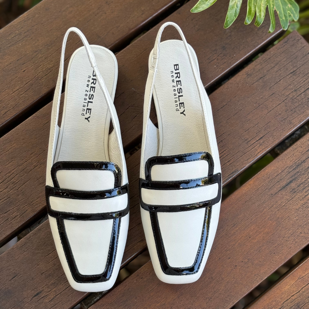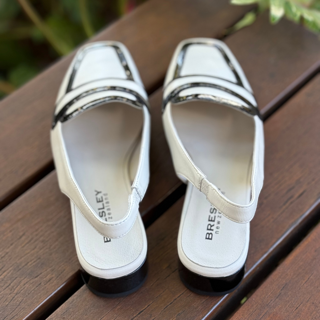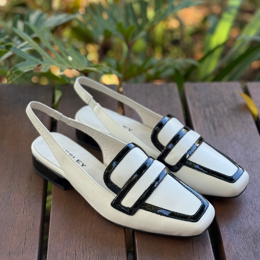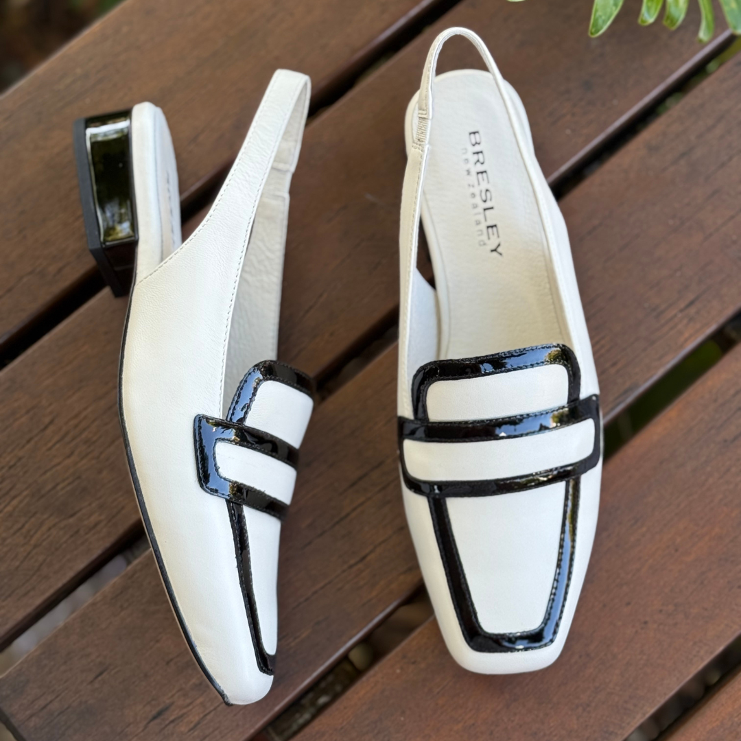 Step into effortless elegance with Ragus by Bresley, a modern slingback loafer that blends classic structure with contemporary flair. Crafted in a soft bone leather and finished with bold black patent accents, this chic style offers a refined look that instantly elevates any outfit.