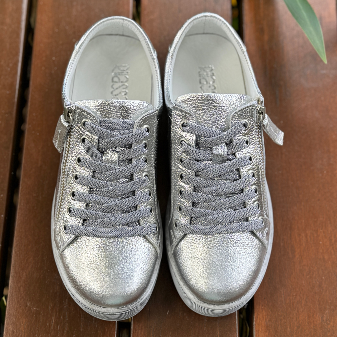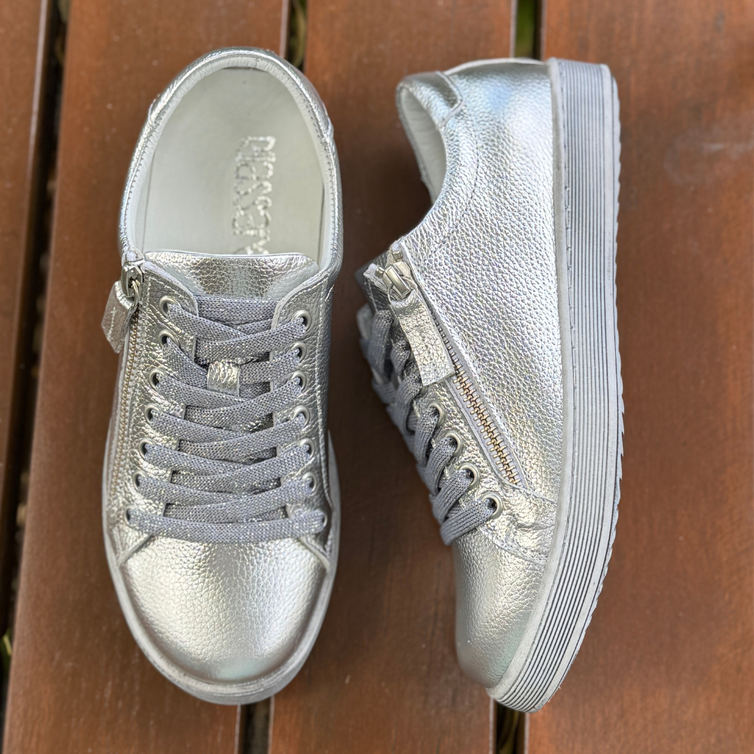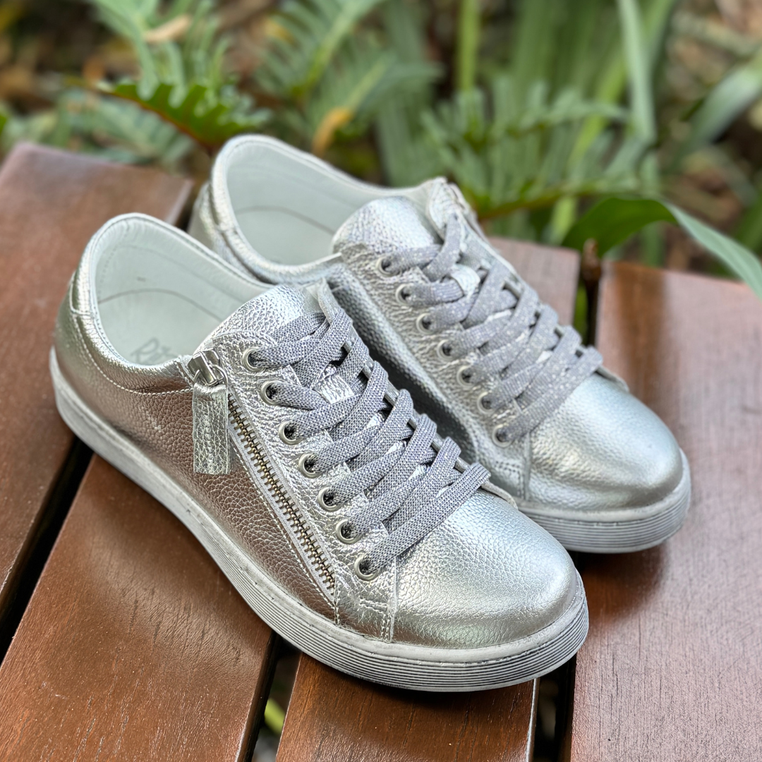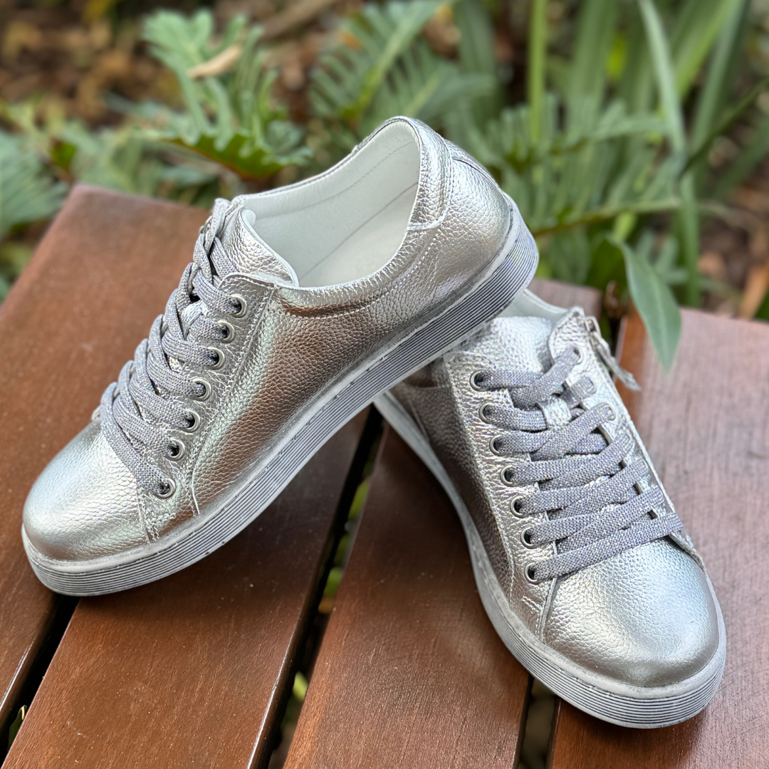 The shimmering silver hue adds a modern, versatile twist that pairs effortlessly with denim, neutrals, whites, and pastels. A functional side zip makes them easy to slip on and off, while the lace-up front allows you to customise your fit.