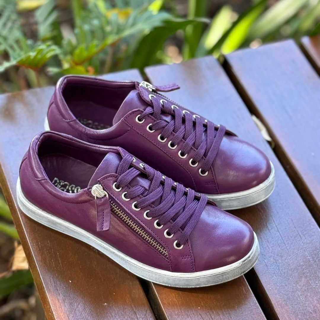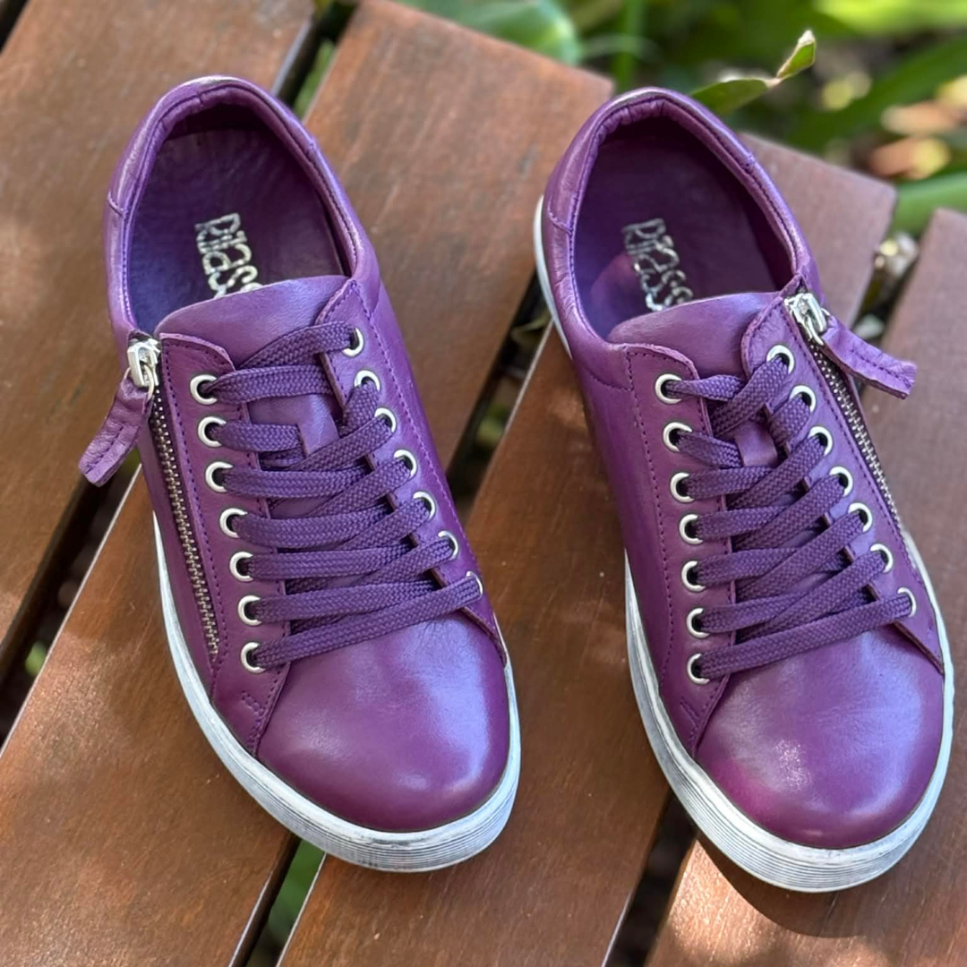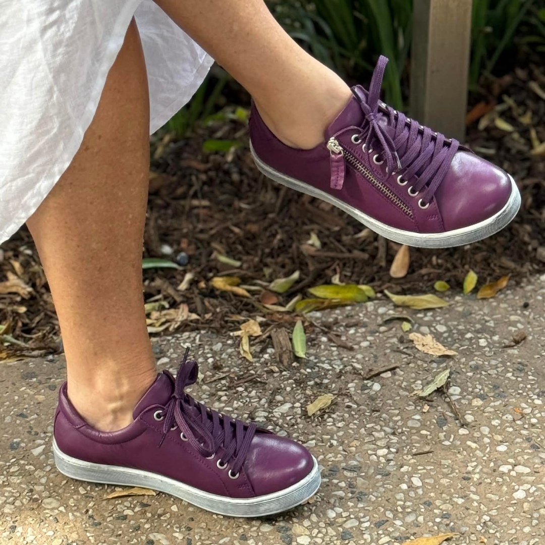 Add a rich pop of colour to your everyday wardrobe with the Rilassare Token Leather Sneakers in Plum. Crafted from beautifully soft leather, this casual lace-up sneaker is designed for comfort, flexibility and effortless wear—perfect for busy days when you’re on and off your feet.