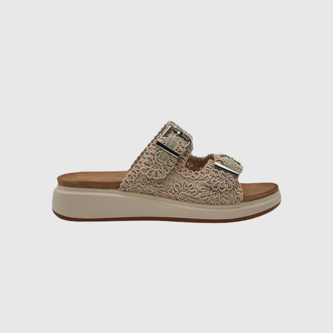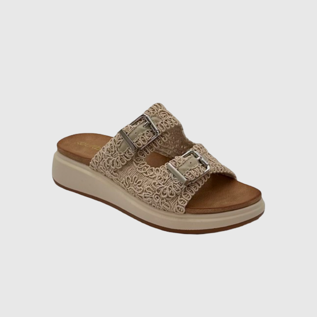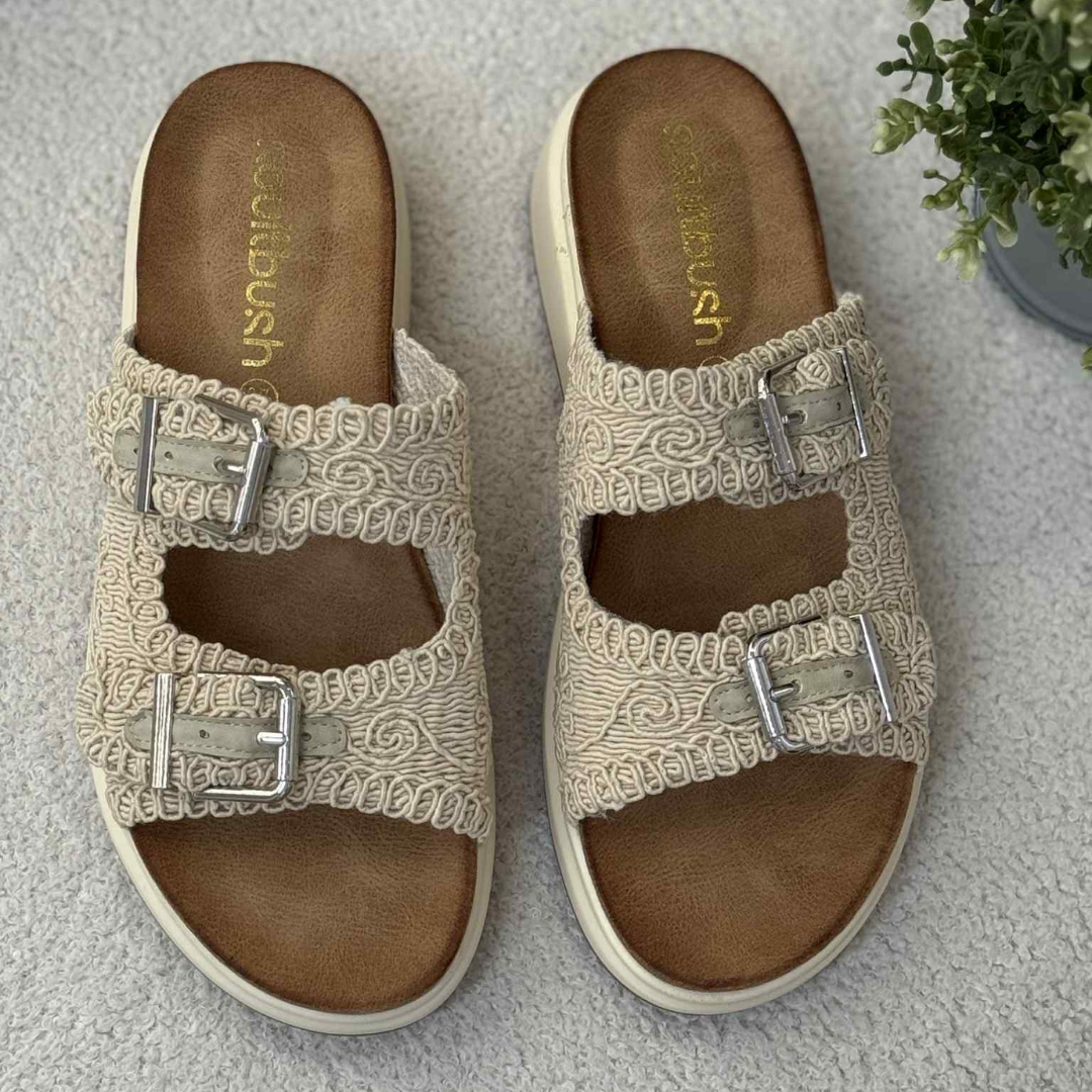 Stay stylish and comfortable in these versatile double buckle slide sandals. Designed with a detailed woven upper and adjustable metal buckles, they offer a secure, customisable fit. The cushioned footbed and lightweight platform sole provide superior comfort and support, making them perfect for everyday wear.