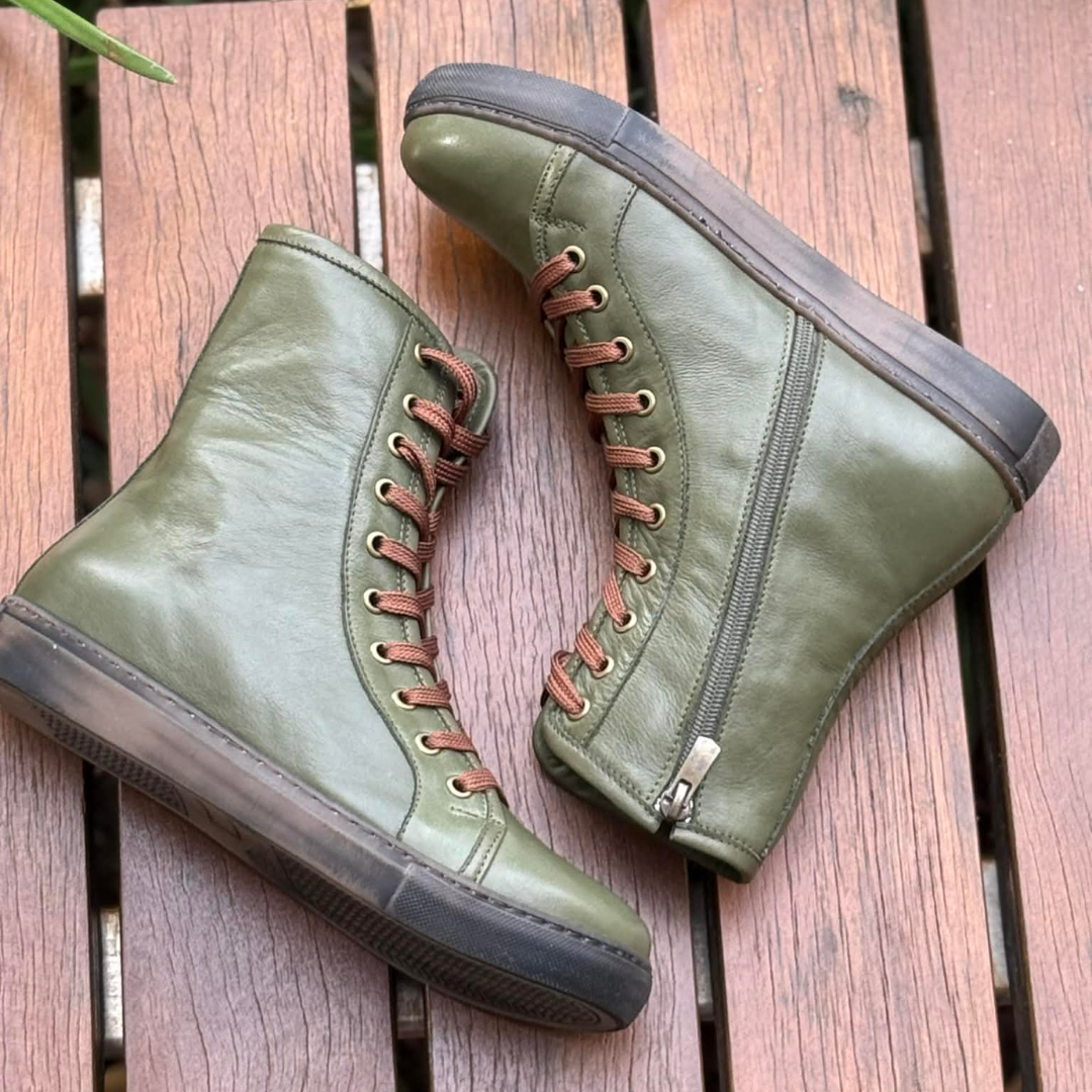 Step into style and comfort with the Rilassare Tallwood boots. Featuring a soft, olive green leather upper, these boots offer a sleek and modern look with a perfect balance of fashion and practicality. The contrasting warm-toned laces add a pop of colour, giving these boots a unique touch.