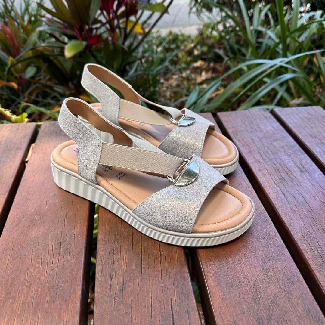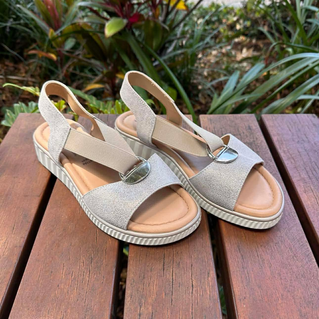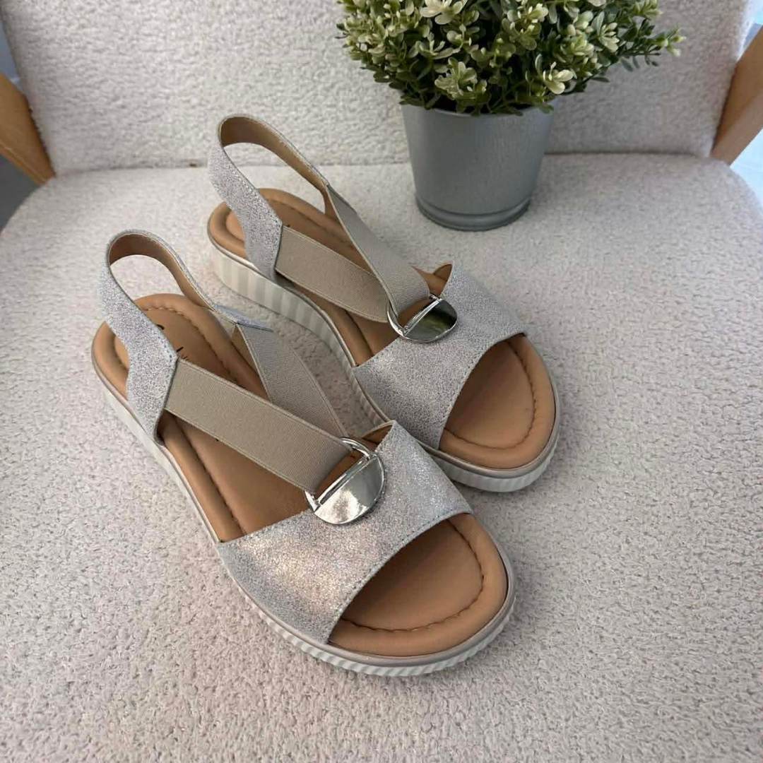 Add subtle shine to your everyday style with these metallic leather sandals by Sundowner. Crafted in Italy, this modern slingback design features soft, shimmering straps paired with a comfortable elasticated side panel for easy wear and a secure fit. A sleek metallic buckle detail adds a contemporary touch.