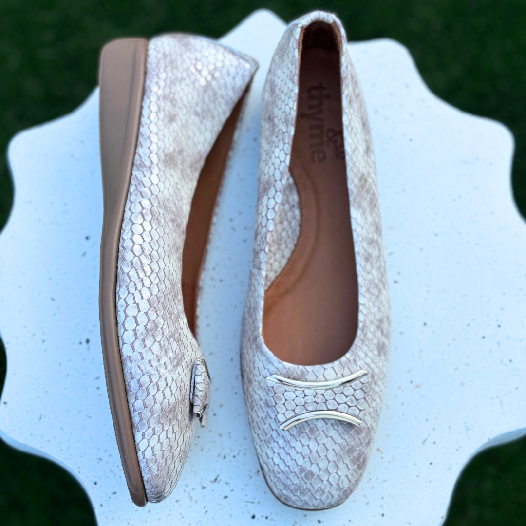 Elegant, understated, and effortlessly wearable, the Thyme & Co Evolve Flat in Beige Croc is a refined everyday style designed for comfort and versatility. Crafted from soft leather with a subtle croc-embossed finish, this slip-on flat adds texture and interest while remaining beautifully neutral.