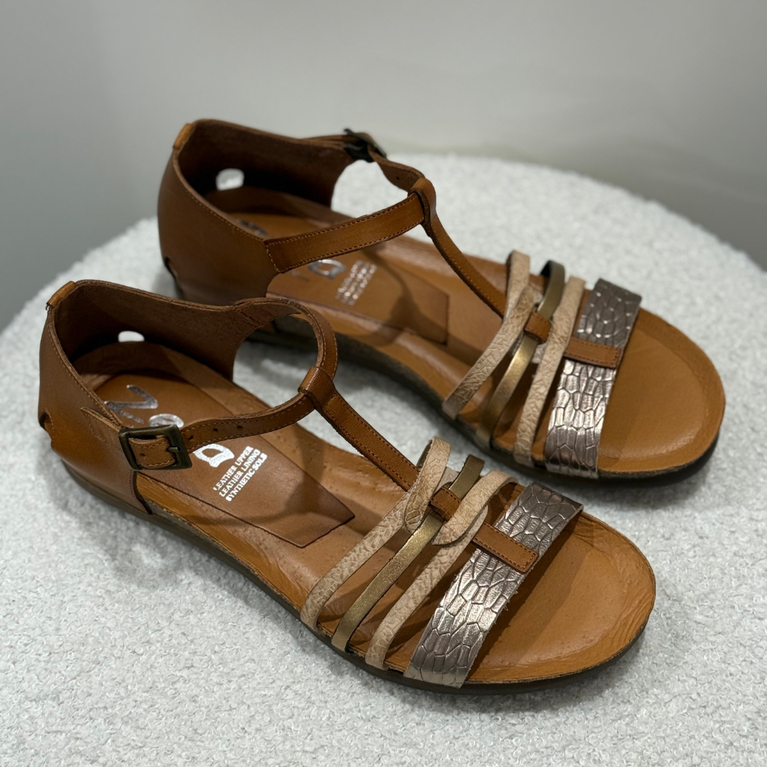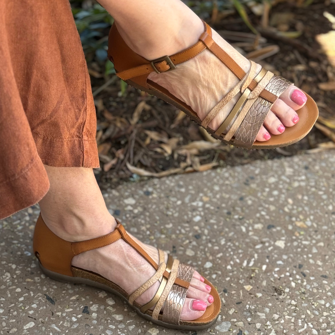 Step into earthy elegance with the Zeta Rapport sandal in Tan Multi. Crafted in Spain from soft leather, this closed-back sandal features a secure ankle strap and a mix of metallic, print, and neutral-toned front straps. The cushioned footbed and lightweight sole ensure all-day comfort, making it a go-to choice for everyday wear.