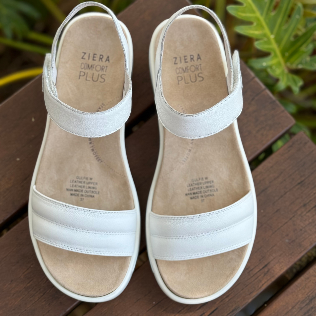 Step into fresh summer style with the Ziera Gulfie Sandals in classic white. Designed for all-day comfort, Gulfie features a removable Comfort Plus footbed with moderate arch support and a gentle metatarsal bump, providing stability and cloudlike cushioning. The adjustable Velcro strap make them easy to slip on and customise, while the lightweight wedge sole adds just the right amount of lift for effortless wear.