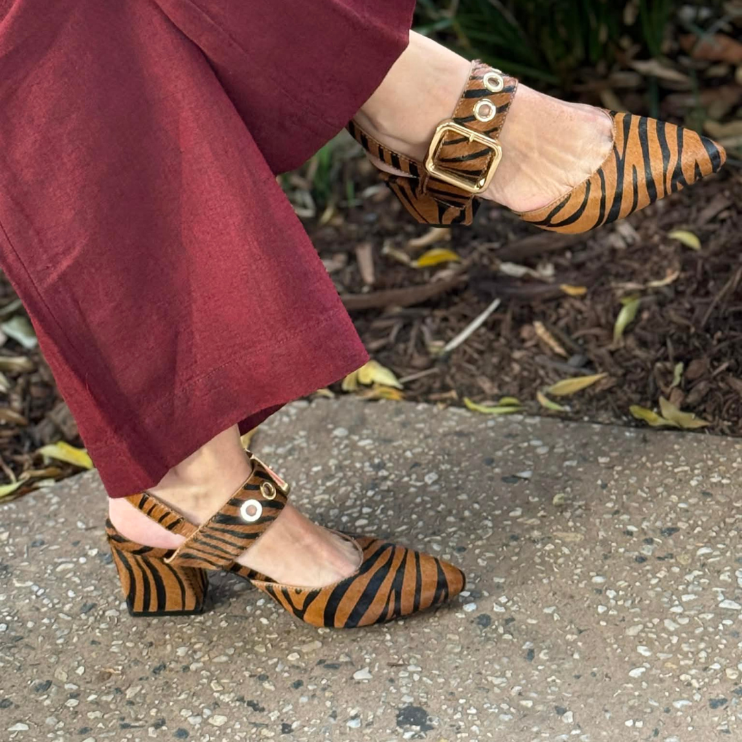 Put a bold spin on your style with these Tan Black Print heels by Django & Juliette. A statement buckle and a pointed toe makes MAGALY a sharp outfit option you'll love to wear.